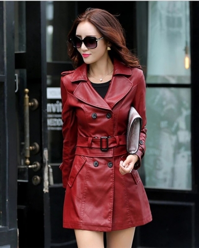 2022 Autumn New Women Long Leather Jacket Slim Oversize Bow