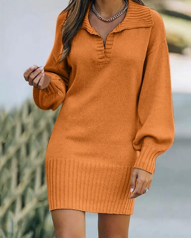 Women Casual Knitted Sweater Mini Dress Solid Color Turn Down
