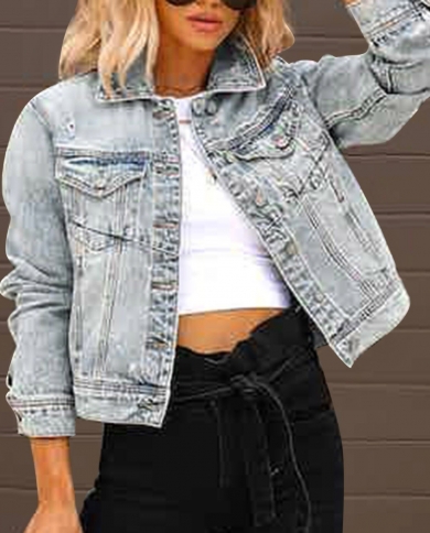 Women Fashion Cropped Denim Jacket Autumn Long Sleeve Single Breasted