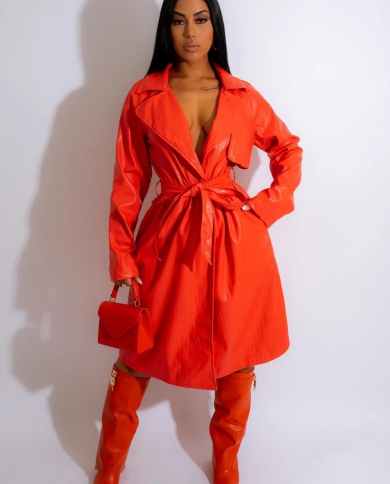 Autumn Long Leather Trench Coat For Women Long Sleeve Belt