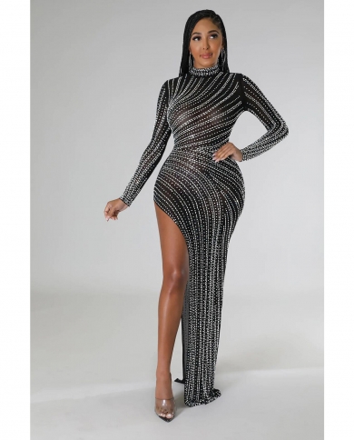 Women Hot Rhinestones Mesh See Though Skinny Long Sleeve