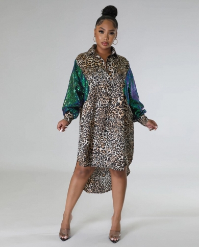 Women Sequines Long Sleeve Patchwork Leopard Single Breasted Lapel Collar