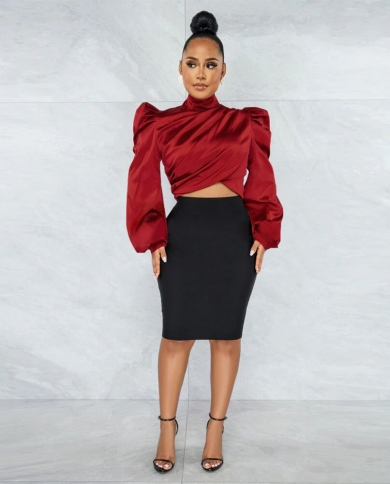 Silk Cropped Top Ladies Blouse Puff Sleeve Ruched Turtleneck