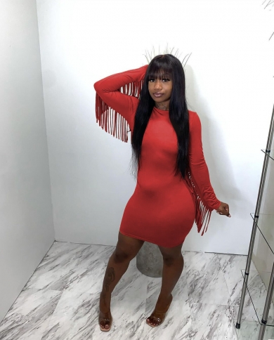 Solid Bodycon Wrap Long Sleeve Party Wear Fringe Crew