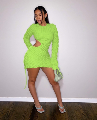 Women Fashion Long Sleeve Seersucker Drawstring Lace Up Cutout Waist
