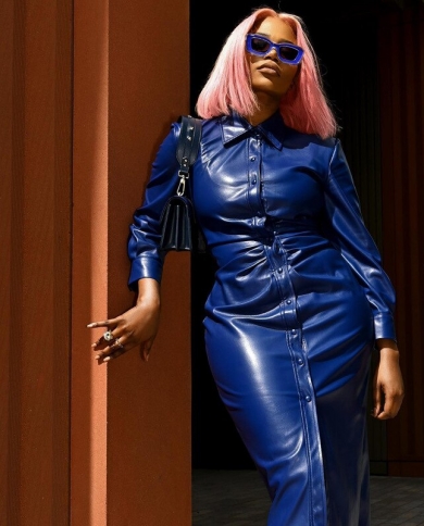 Spring Autumn Women Midi Dress Fashion Temperament Pu Leather Single