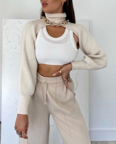 Women Sweater Solid High Collar Long Puff Sleeve Knitwear Pullover