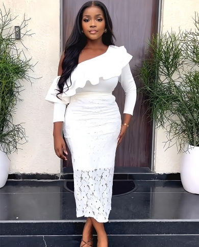 Women Lace Dress Off Shoulder Ruffles Package Hip Party White