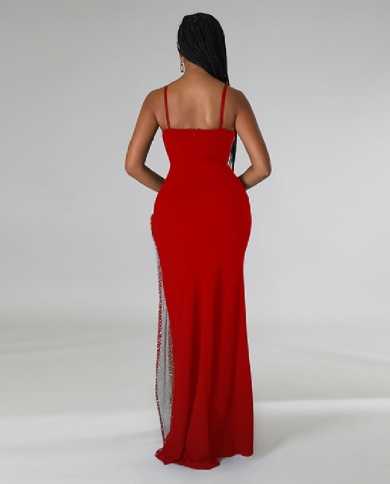 Rhinestone Crystal Patchwork High Split Maxi Dress Women Sleeveless