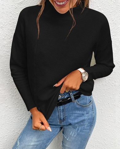 Solid Color Ribbed Knitted Sweater Women Casual Long Sleeve Tops
