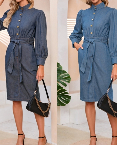 Autumn Long Sleeve Denim Dress Women Stand Collar Blue Jean