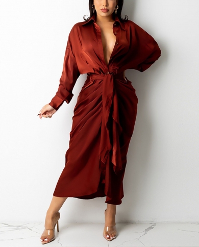 Elegant Lace Up Shirt Dress Women Autumn Long Sleeve Tie