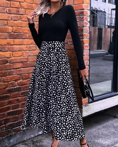 Womens Long Sleeve V Neck Ruffle Polka Dot Dress Casual