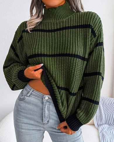 Winter Womens Oversized Long Sleeve Striped Sweater Casual Turtleneck Side