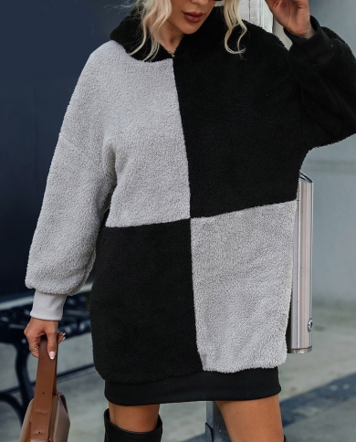 Womens Pullover Long Sleeved Hooded Loose Black Grey Color Matching