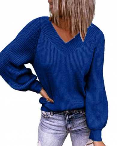 Casual Loose Solid Color V Neck Sweater Pullovers Women 2022