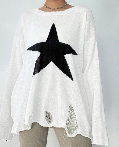 Ripped Hole Star Oversized Sweater Women Preppy Style Casual Loose