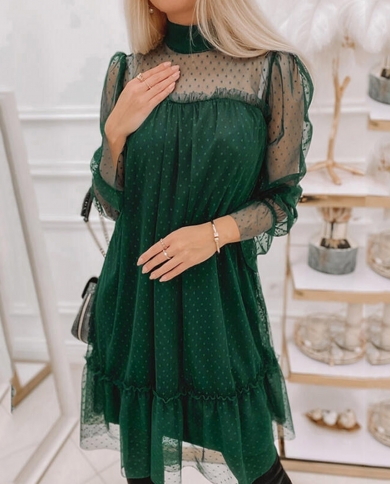 Womens Elegant Mesh Patckwork Green Party Dress Loose Casual Hollow