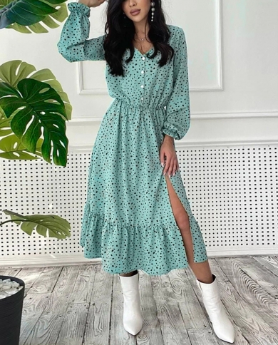 Women Elegant Ruffle Long Sleeve Polka Dot V Neck Slit