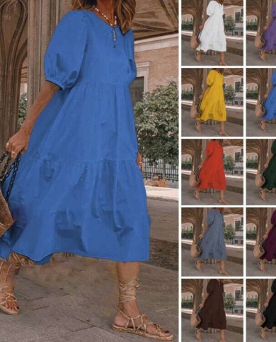 Summer Dress Vintage Lantern Sleeve Mid Calf Dress Beach