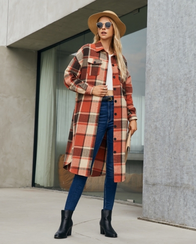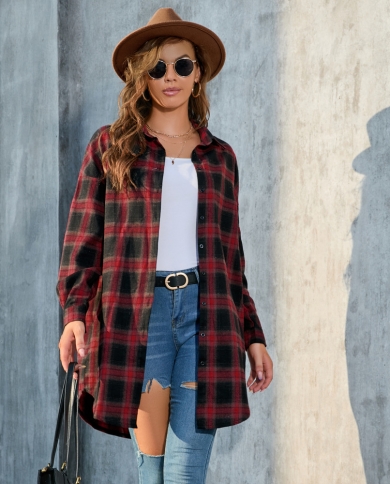 Large Size Womens Long-sleeved Autumn Mid-length Plaid Shirt Retro Jacket