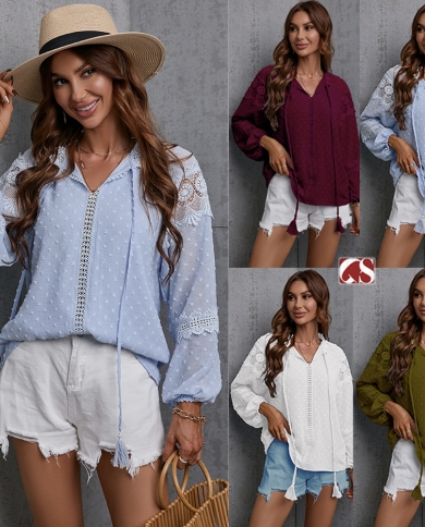 Womens Half-Open Collar Lantern Sleeve Dot Chiffon Patchwork Lace Loose