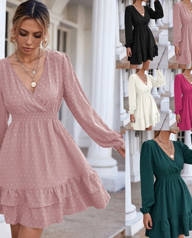 Womens V-Neck Long Sleeve Ruffle Slim Fit Commuter Swing Dress