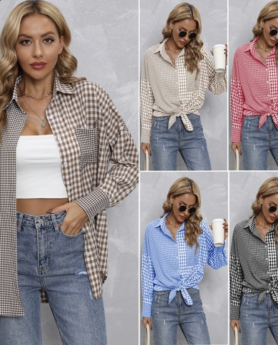 Womens New Lapel Plaid Color Matching Loose Casual Shirt
