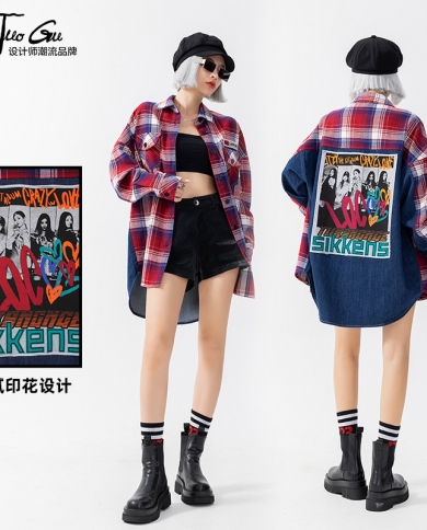 Womens Fashion Denim Jacket Cardigan Embroidery Plaid Shirt