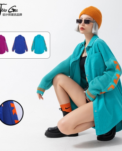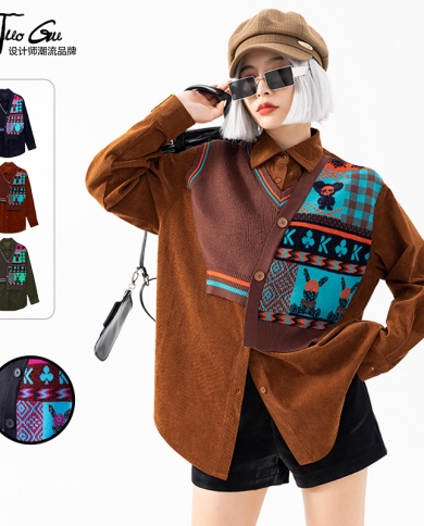 Womens Loose Knitted Vest Fake Two-piece Casual Shirt Corduroy Long-sleeved