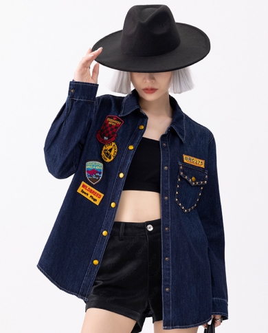 Womens Rivet Loose Denim Jacket All-match Embroidered Patch Shirt