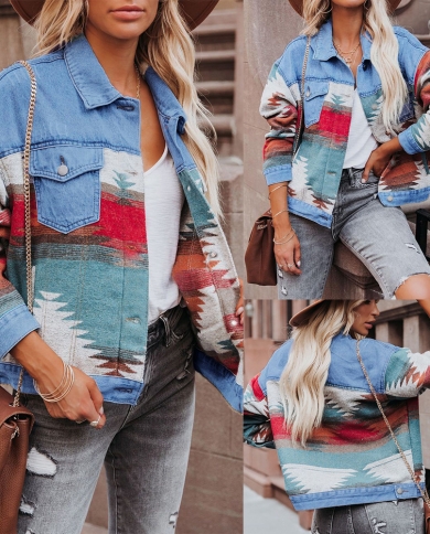 Geometric Pattern Cropped Denim Panel Loose Womens Wool Jacket