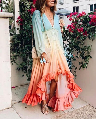 Summer Boho Vintage Single Row Gradiented Ruffles Long Dress Womens