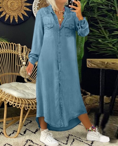 Women Vintage Casual Solid Denim Dress Summer Fashion V Neck