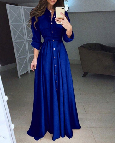 Fashion Elegant Long Maxi Dress Women High Waist Turndown Collar