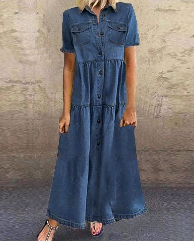 Summer New Denim Half Sleeve Long Dresses Ladies Women Fashion