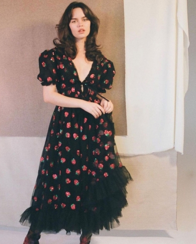 Women Vintage Strawberry Sequins Embroidery Mesh Party Dress A Line