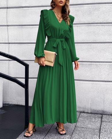 Ladies Autumn Winter Vintage Elegant Ruffles Pleated Long Dress For