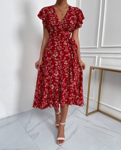 Summer Women Vintage Floral Dress Casual Ruffles Bandage Midi Dress