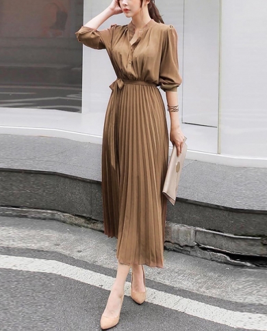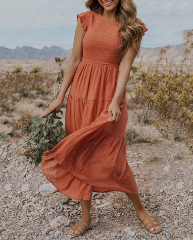 Women Summer Bohemian Pleated Dress Fashion Elegant Solid Color Elastic
