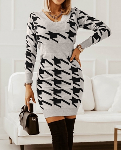 Autumn Winter Women Patchwork Knitting Midi Dress Casual Long Sleeve