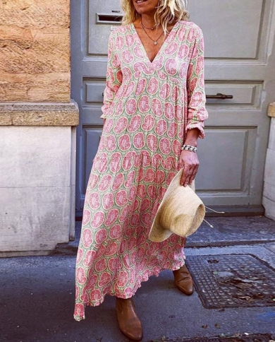 Women Elegant Casual Flare Long Sleeve Floral Long Dress Autumn