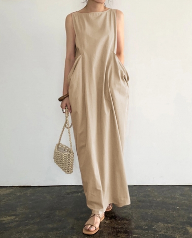 Summer Women Casual Sleeveless Long Dress Elegant Temperament Solid Color