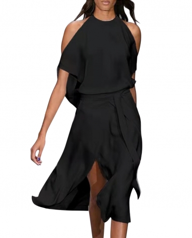 Elegant Off Shoulder Pleated Slim Slit Dress Summer Solid Ruffle