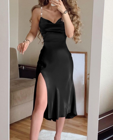 Women Fashion Diamonds Spaghetti Strap Midi Dress Party Slip
