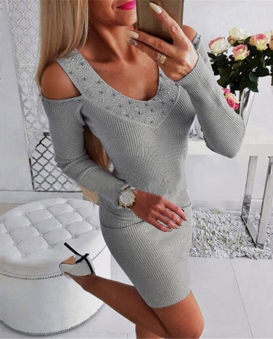 Womens Casual Cold Shoulder Solid Long Sleeve Short Swing Dress
