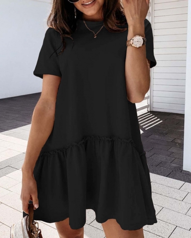 Womens Summer Loose Temperament Solid Color Loose Round Neck Ruffle