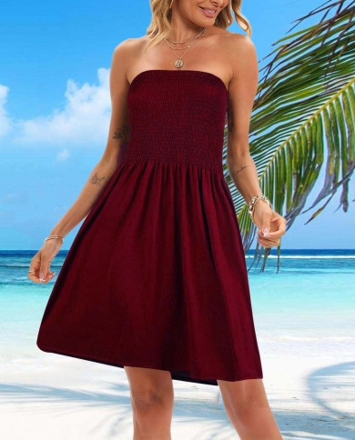 Women Strapless Dress Summer Casual Ruched Solid Color Elastic