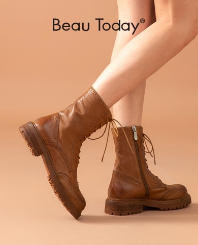 Beautoday Ankle Boots Women Genuine Calf Leather Crosstied Round Toe